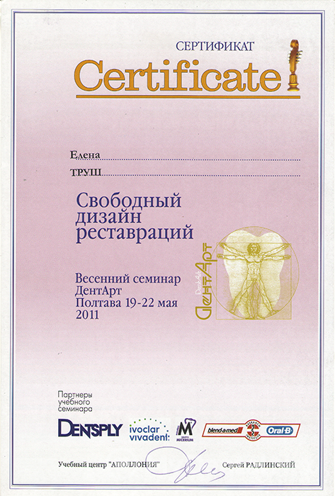 2011 г. Участие в практическом семинаре «Свободный дизайн реставраций» г. Полтава