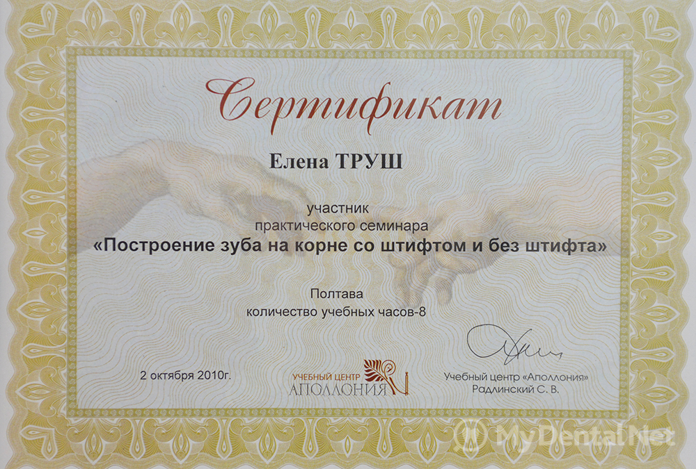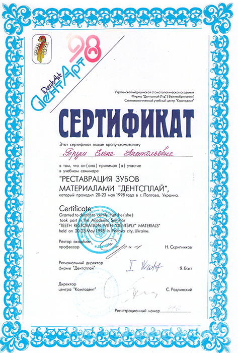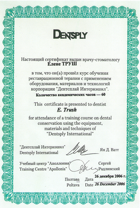 2006 г. Прошла курс обучения реставрационной терапии с применением оборудования, материалов и технологий корпорации «Dentsply International» учебный центр «Аполлония» г.Полтава