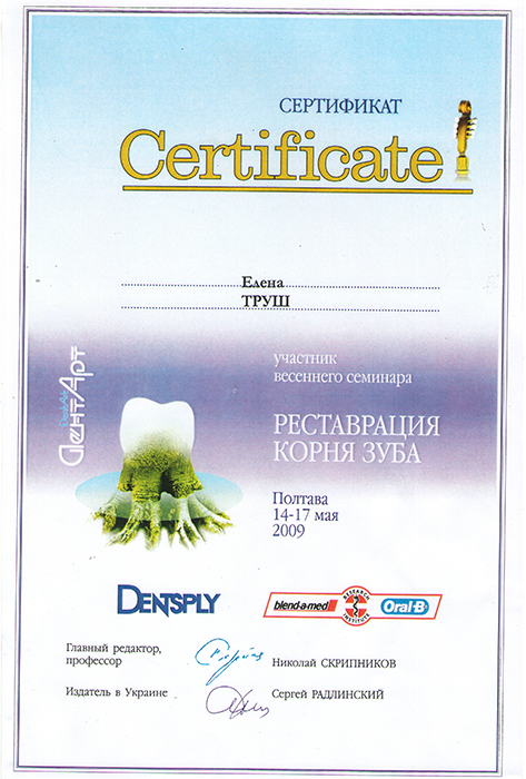 2009 г. Участие в семинаре «Дент Арт» «Реставрация корня зуба»