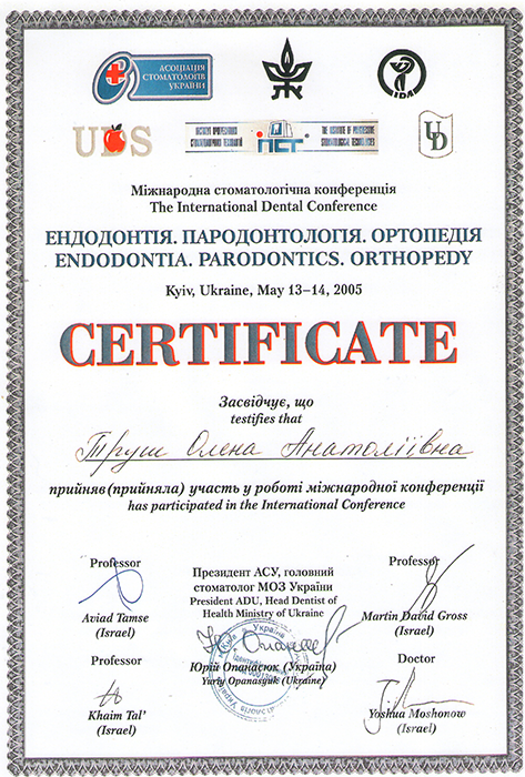 2005г. Участие в международной стоматологической конференции«ЭДОДОНТИЯ.ПАРОДОНТОЛОГИЯ.ОРТОПЕДИЯ» г. Киев.