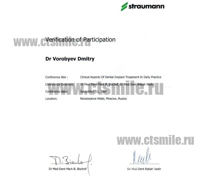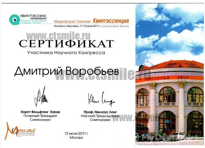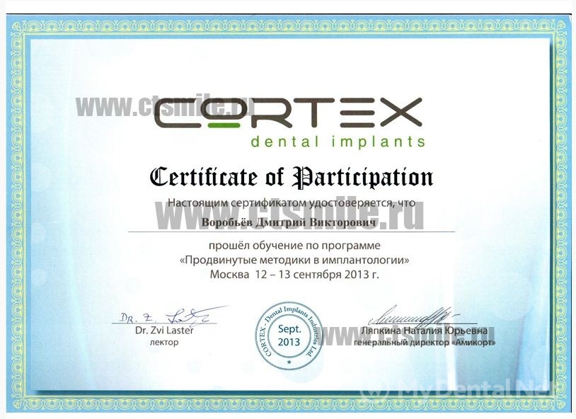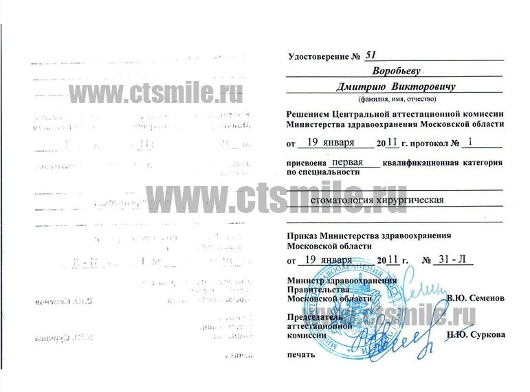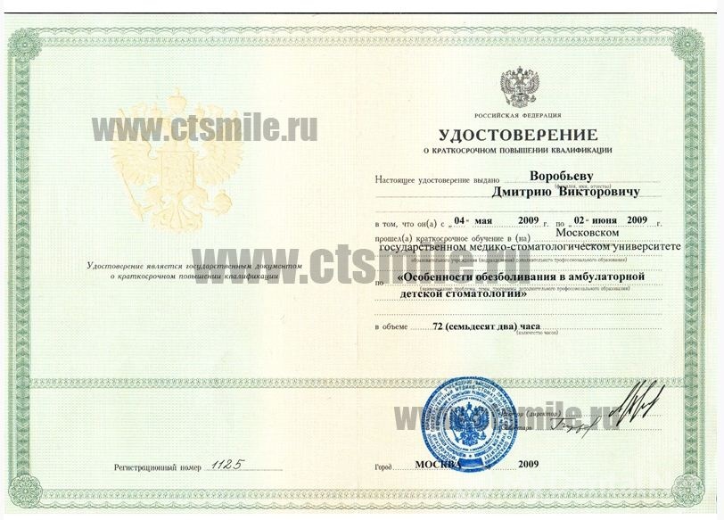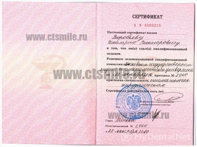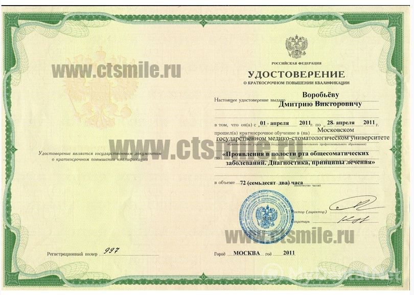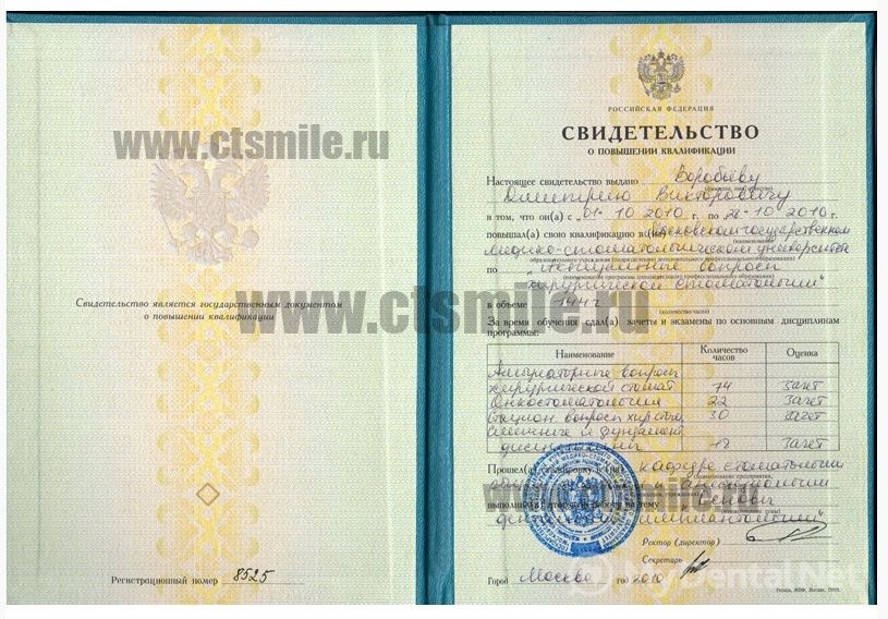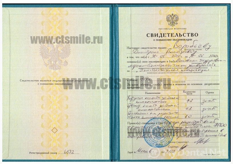 2010 г. - Повышение квалификации в МГМСУ «Стоматологическая имплантация»;