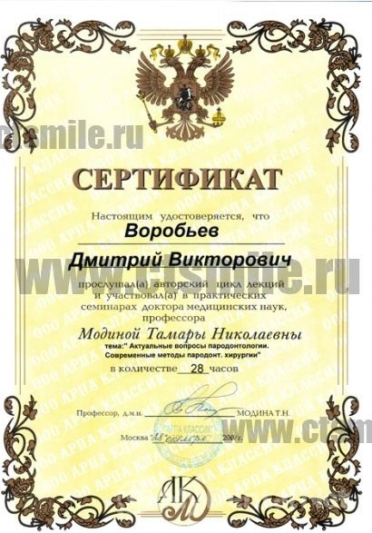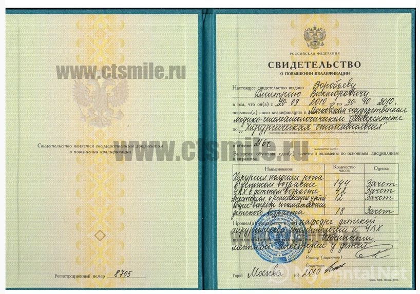 2010 г. - Повышение квалификации в МГМСУ «Актуальные вопросы хирургической стоматологии»;