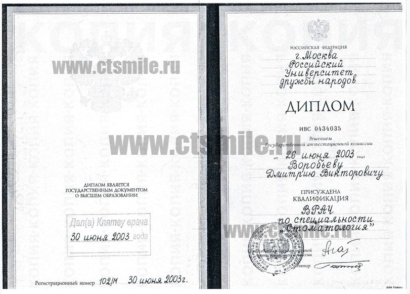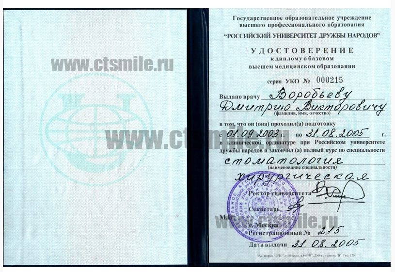 Российский Университет Дружбы Народов по специализации хирургическая стоматология. Врач первой категории. – 2003 г.